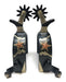 The AJ Tack Men's Star Double Shooter Spurs are crafted from black steel, featuring a hand-engraved silver overlay with a double pistols and copper stars design. These spurs include silver engraving and a chap guard on the shank, with silver stars on the buttons. The spurs are designed to offer both style and functionality for show and everyday use.